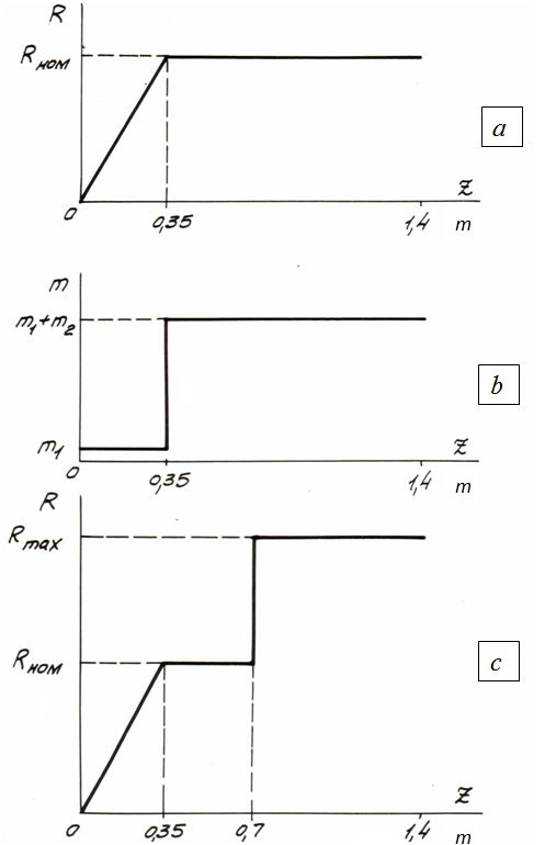 Fig. 2. The load from a column of the concrete mixture, acting on the concrete mixture cylinders pistons, rigidly connected by the general rods with pistons of hydraulic cylinders, is set by two components: variable force in function of the hydraulic cylinder piston movement z , simulating process of compression of a mixture in view of incomplete filling of the concrete mixture cylinders and process of its movement with the certain resistance (Fig. 2, a ), and the variable mass reduced to the hydraulic cylinder rod (Fig. 2, b ), equal to sum of masses of the hydraulic cylinder piston with a rod and the concrete mixture cylinder piston on an initial piece of movement ( z ≤ 0.35 m, Fig. 2, b ) and undergoing a jump at z = 0.35 m in view of addition of mass of a column of a concrete mixture. Clearly, that such model of a load does not consider possible fluctuations of pressure in a concrete mixture. However, the account of this component becomes possible only after carrying out of appropriating experiments with objective of studying of character of wave and oscillatory processes in a concrete pipeline.For modeling of emergency operation of stopping of the hydraulic cylinder at sharp increase of a load (and studying of dynamics of hydraulic system at operation of a pressure relief valve) in addition to dependence (Fig. 2, a ) a case of sharp jump of a load (Fig. 2, c ) at z ≥ 0.7 m has been considered. The dynamic analysis of working processes in the main hydraulic drive of the auto concrete pump SB-126 was spent for the following modes: 1) a horizontal position of a boom at a rated load of movement resistance; 2) a horizontal position of a boom at a jump of load up to maximal (stopping of the hydraulic cylinder) at: a) the disconnected power regulator, b) the connected power regulator; 3) a vertical position of a boom at a nominal and maximal load. As a result of calculation of transients on a pressure р 5 in the hydraulic cylinder (node 5 in the rated diagram, Fig. 1, b ), a speed v 7 and a movement z 7 of the hydraulic cylinder rod (node 7, Fig. 1, b ), a movement z 12 of plunger of a power regulator (node 12, Fig. 1, b ) in function of time t have been received.