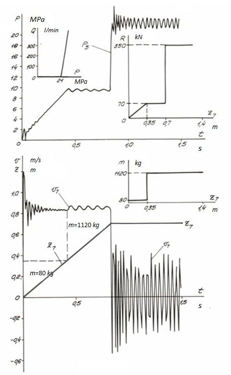 Fig. 4. On Fig. 4 transients in the auto concrete pump hydraulic drive are presented at the disconnected power regulator. At 0 ≤ z 7 ≤ 0.7 m in the system rated loads operate; at z 7 > 0.7 m the load on rod R 7 changes unevenly from 68.6 kN up to 343 kN (simulating an absolute obstacle). Pressure р 5 increases thus up to value of pressure relief valve adjustment which work is modeled by its static characteristic Q ( p ).