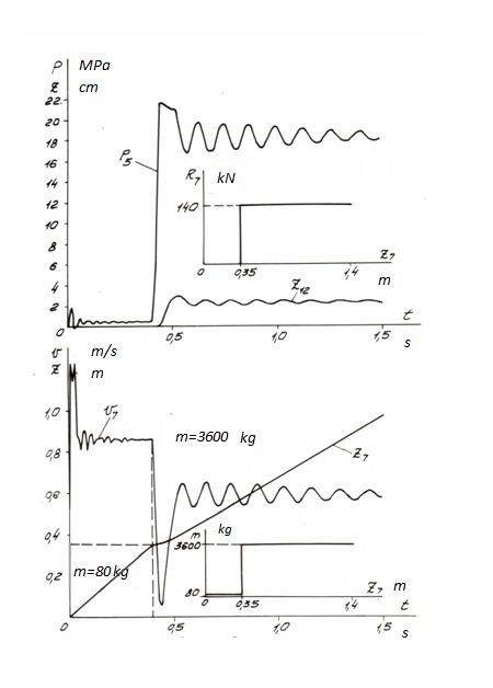 Fig. 3. For this mode enough smooth variation of pressure р 5 , despite of spasmodic variation of the reduced mass which affects only own frequency of fluctuations changing too unevenly at z 7 = 0.35 m from 30 Hz up to 11.4 Hz is characteristic. As at the set load pressure р 5 does not reach the adjustment pressure of a power regulator (~13 MPa), the last does not put into operation.